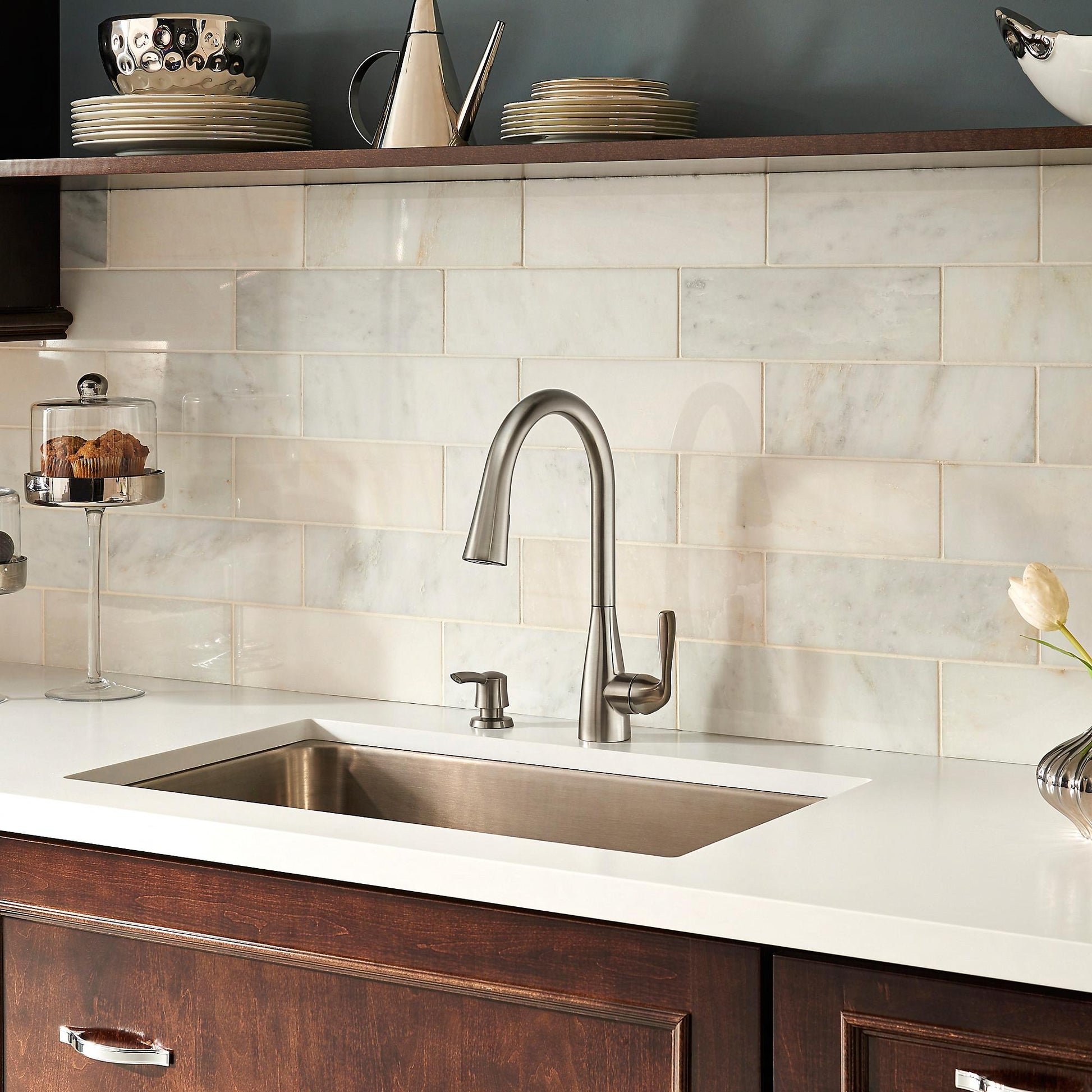 - Pull-Down sprayhead with toggle button to select spray or stream modes conveniently in the palm of your hand